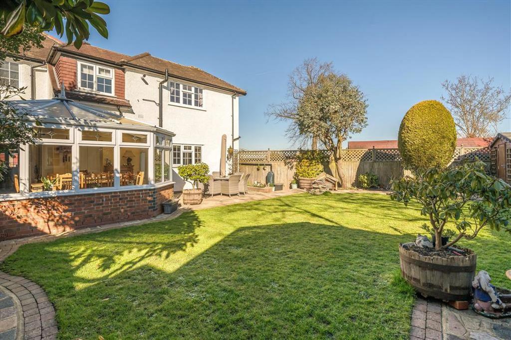The rear garden is a family's dream; ample paved spaces for sitting and dining areas combined with a large lawn and well-established borders creating a wonderfully generous space for kids to play.