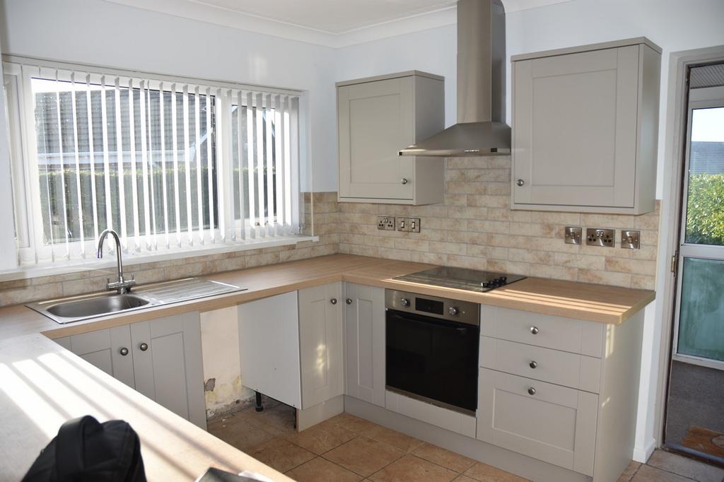 11’ 4” x 9’ 7”. Large window overlooking the front of the property with vertical blinds, above a single drainer stainless-steel sink unit with monobloc style tap. Pleasant range of wall & base units. Tiled splashbacks. Built in cooker with ceramic hob, extractor fan and light above. Plumbing for washing machine. Hard-wired smoke alarm. Downlighters & strip light. Double thermostatically controlled radiator. Ceramic tiled floor. Glazed door through to the conservatory.