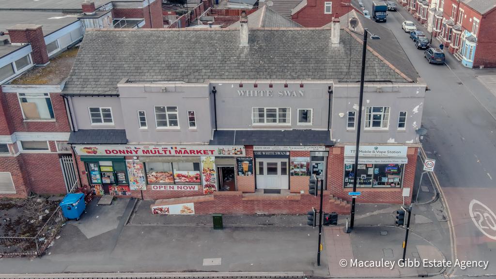 Introducing The White Swan Hotel, a fantastic commercial property opportunity in Balby, Doncaster. This development features two thriving commercial shops generating £2,600 per month, along with a popular Public House bringing in £700 per month. The upper floor boasts 8 studio apartments, with potential to expand to 10 with the right planning permissions. Once completed, these apartments have the potential to bring in £5,200 per month.