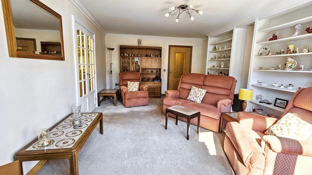 SITTING ROOM (5.5m X 3.9mapprox)(18' x 12'7" approx) with fitted carpet, coving, range of built-in wall shelving units with light. Rear window with blinds, TV aerial point, telephone point, radiator, eight power points, part glazed door to the sun room, and glazed panelled double doors to kitchen.