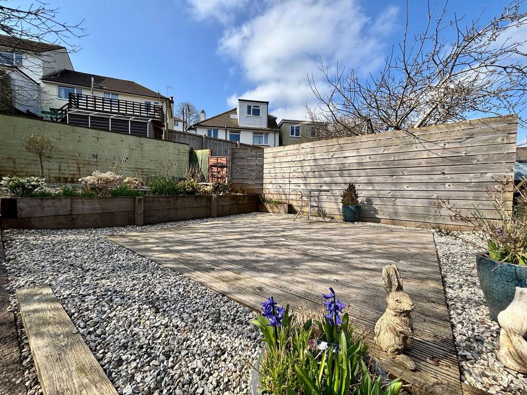 OUTSIDE A large south facing enclosed rear garden that has been thoughtfully designed both for ease of maintenance and following the sun throughout the day with a spacious patio area perfect for outdoor dining and entertaining, a small slope then leads you to the other parts of the garden that have been divided into two pebble stoned sections, a further patio area, a decked area and a large flower bed section also.