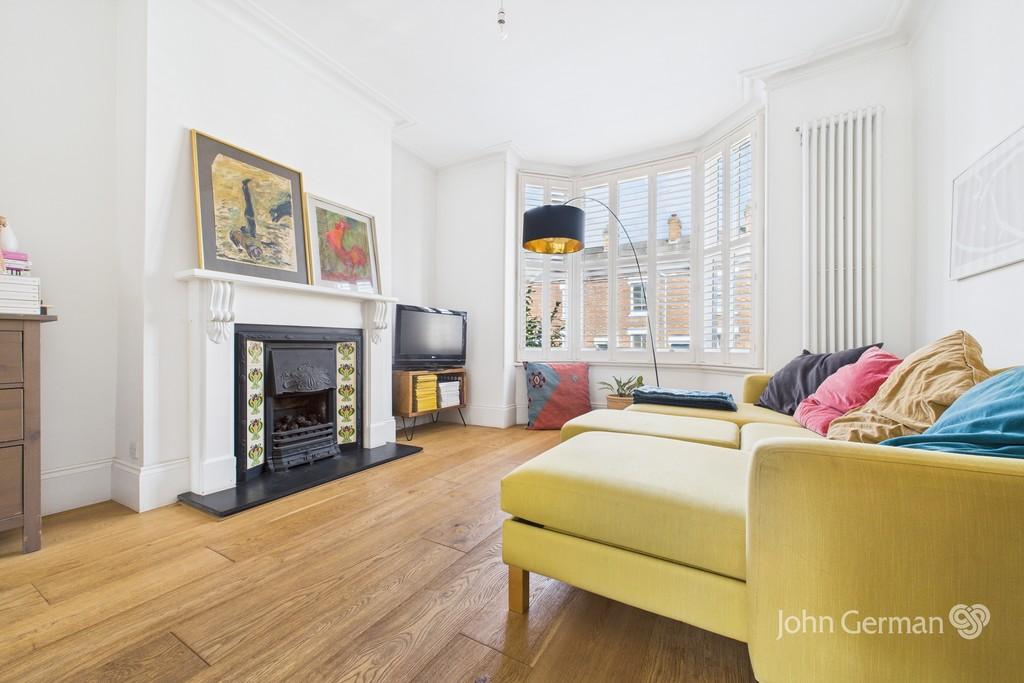 At the heart of the house is a stylish, extended and refitted breakfast kitchen equipped with a range of base units in blue with work surfaces over, twin bowl ceramic sink, spotlights, practical flooring and two windows to the side. To one end of the kitchen is a seating area, making this a superb social space, with French doors opening out to a paved terrace, plus a contemporary radiator. This area could alternatively be utilised to put a breakfast or dining table.