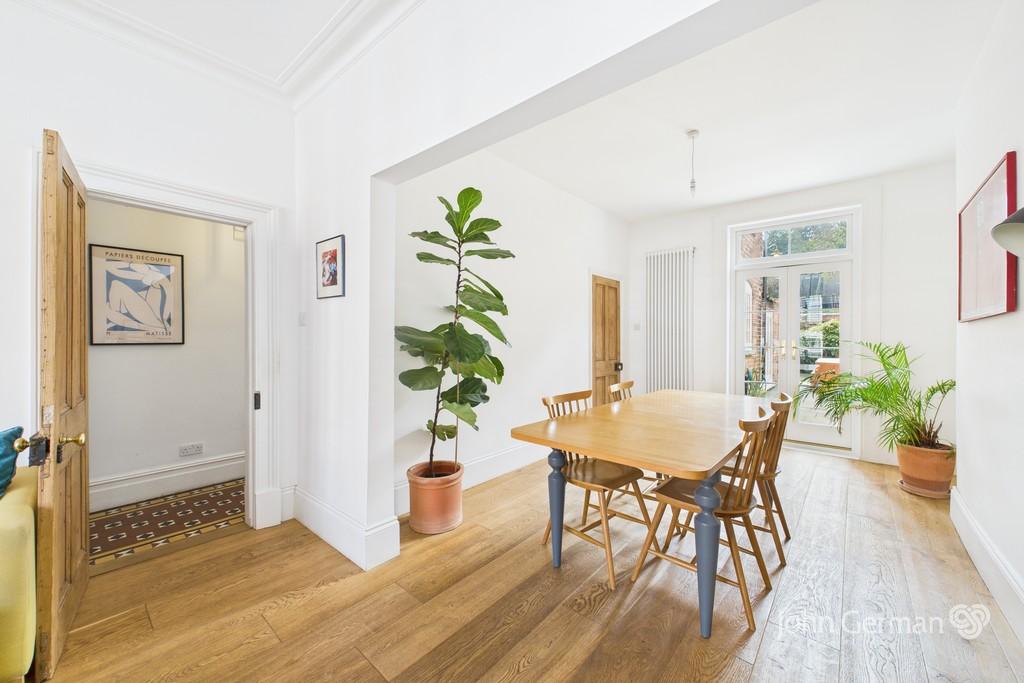 The lounge is a wonderful room, filled with natural light from a large bay window, having high ceilings, wood flooring and a period style fire surround providing the focal point. An open archway provides an open plan feel to a lovely dining room, a perfect space to entertain with French doors opening out to the rear garden. The room also features wood flooring and contemporary white radiators.