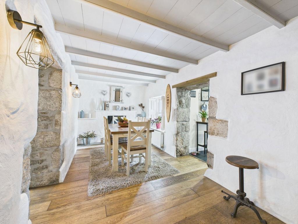 A beautifully presented, semi-detached stone cottage with a large attached garage to the side, featuring a charming Cornish granite façade.