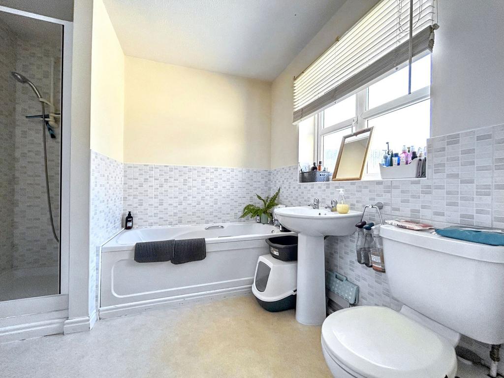 With low level WC, a panelled bath, a wash hand basin, double glazed window, shower cubicle, and a radiator.