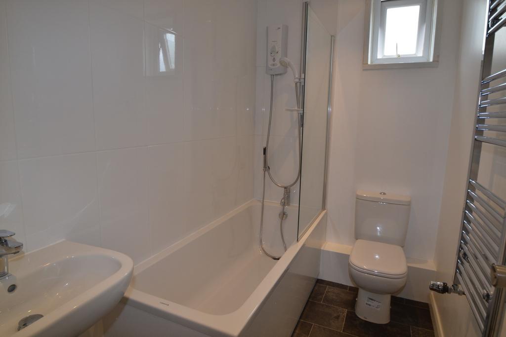 Newly fitted bathroom with white suite comprising bath with electric shower over and glass shower screen. Pedestal wash hand basin with tiled splashback. Fully tiled walls. Complimentary flooring. Combination radiator/towel rail. Opaque double glazed window to the side. Extractor fan.