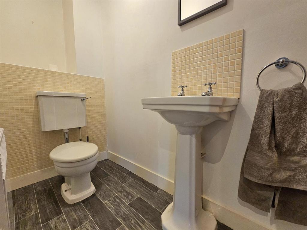 Bathroom - White suite comprising WC, wash hand basin and shower enclosure with tiled surround.