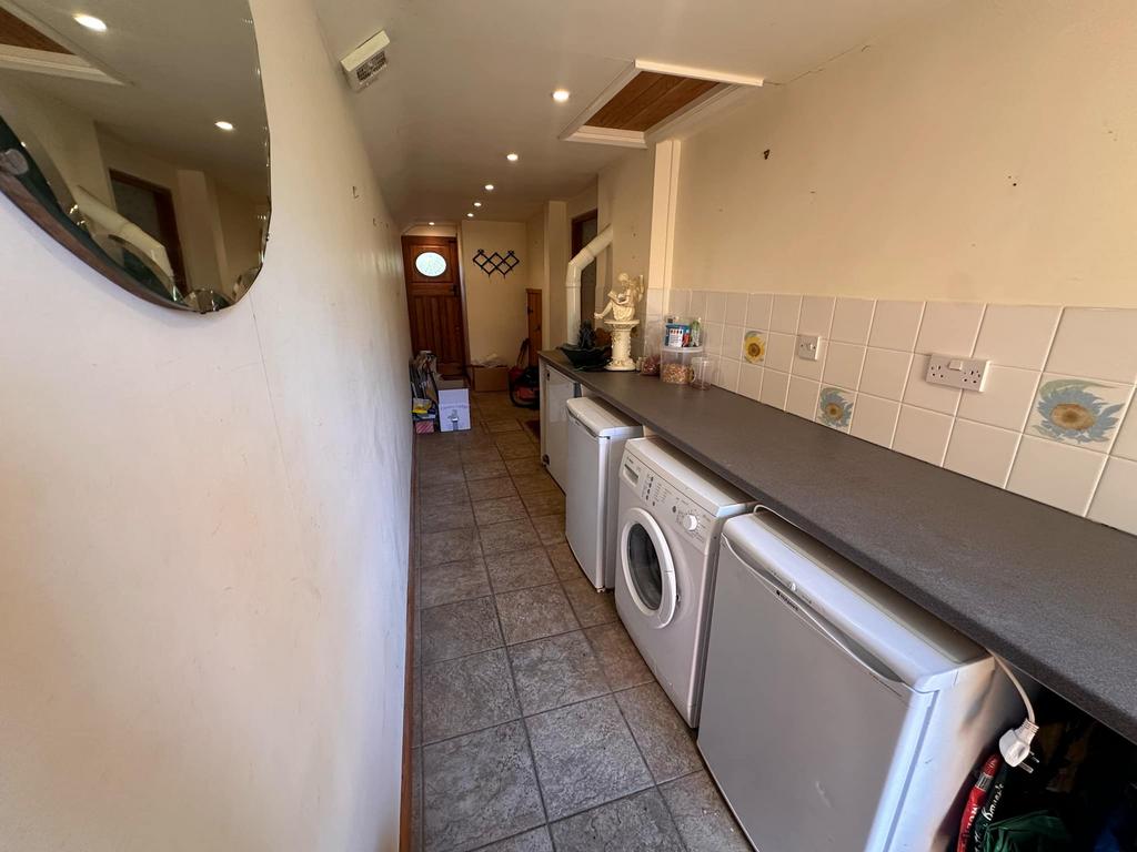 Side utility Room 25ft 7ins x 5ft 2ins Oak doors to front and rear, Worcester central heating boiler, base cupboards and work surfaces with space and connection for washing machine, and fridge freezer.