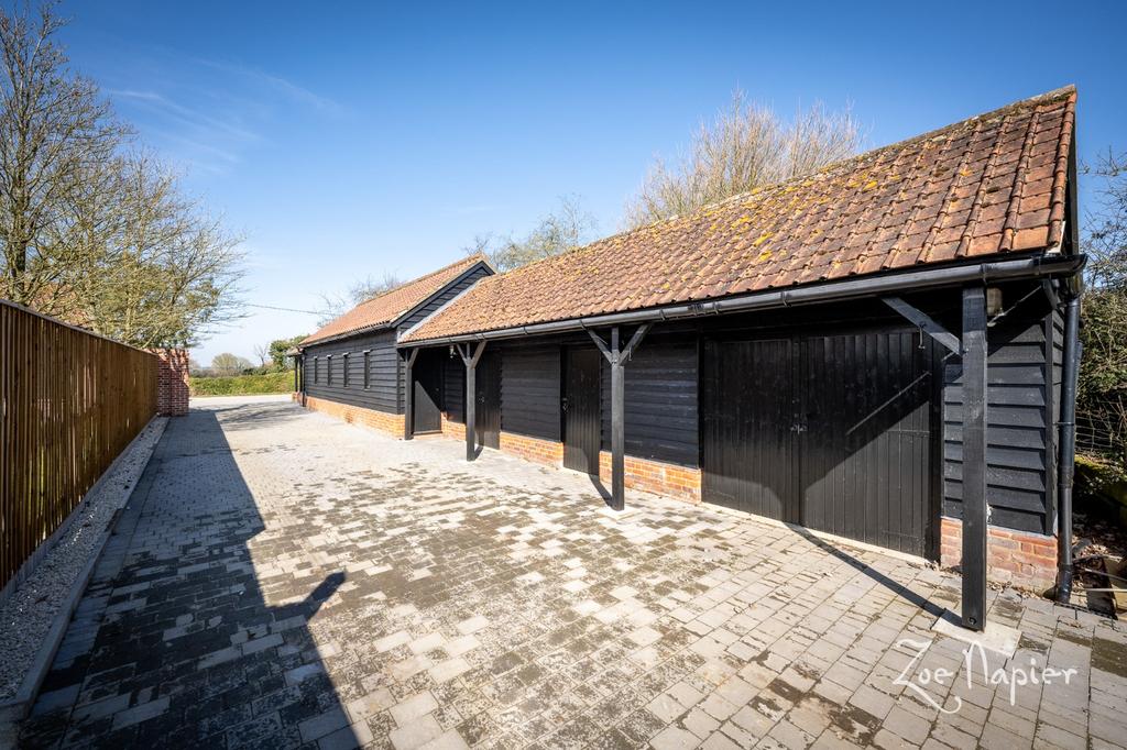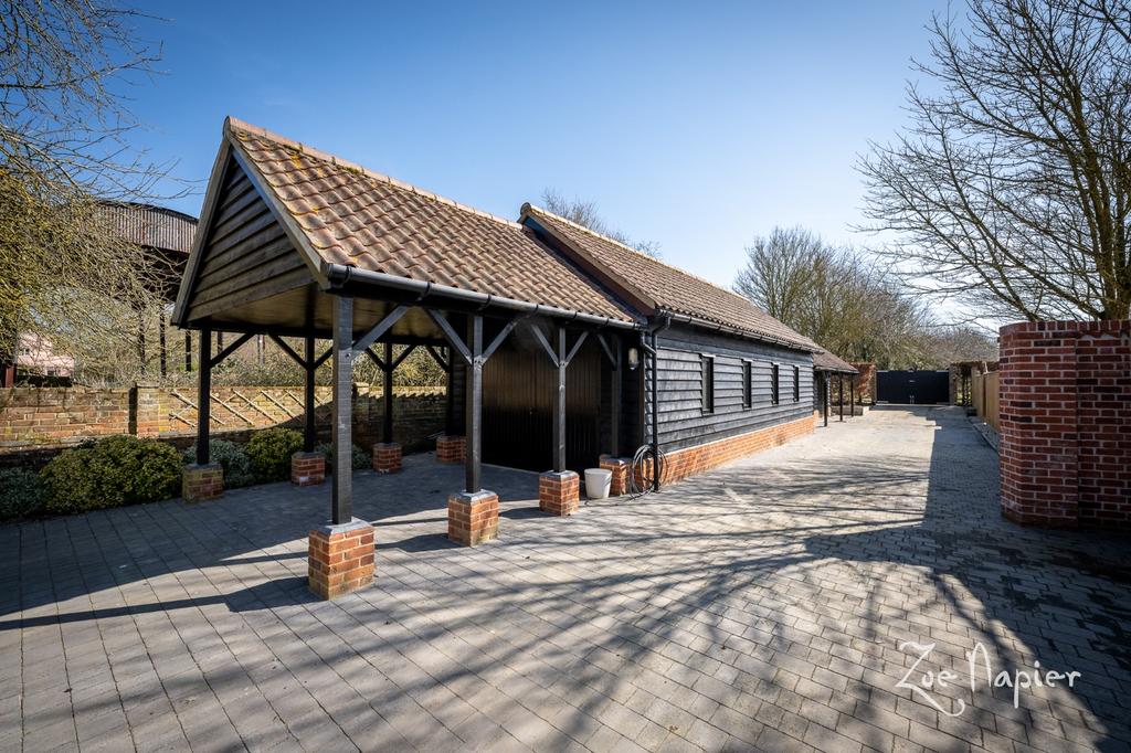 The property is approached via a farm track immediately onto a brick paved driveway providing extensive parking where there is an electric charging point. A separate access and parking areas lie alongside the substantial garage building to house one vehicle with storage/workshop space. Behind are former pony stables, now used as good storage sheds. Close boarded double gates for vehicle access lead to the rear paddock.