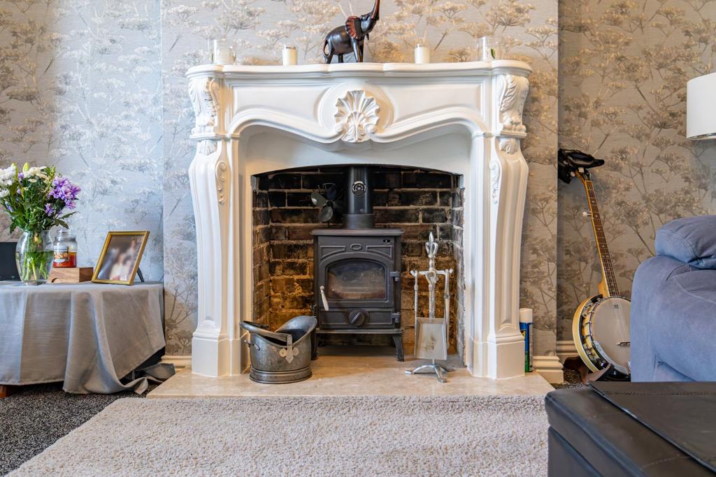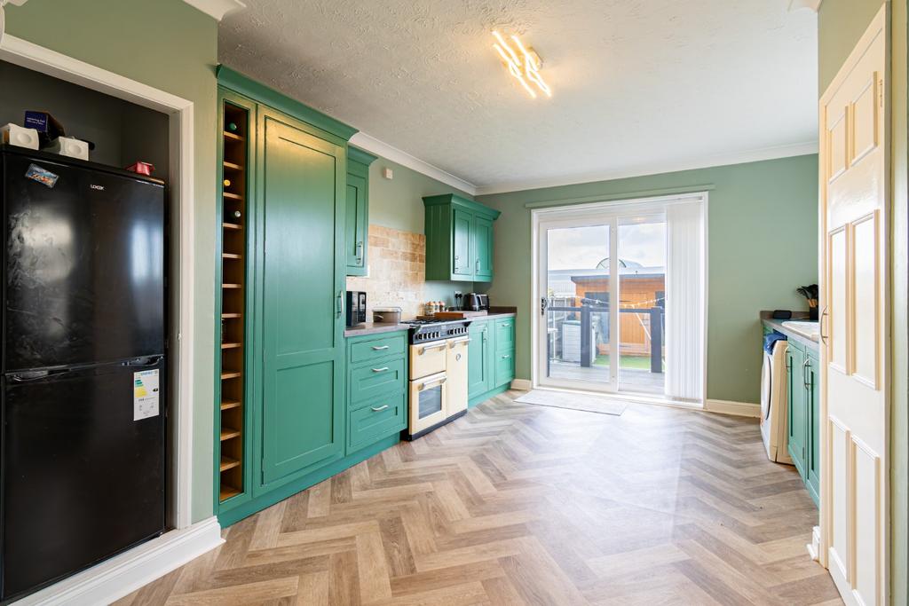 Visitors are welcomed into the spacious bay-fronted sitting room, with a wood burning stove serving as the main focal point. A hand-painted staircase rises to the first-floor landing, below which there is space for coats and shoes, as well as the recently replaced gas-fired central heating boiler. Behind the sitting room is the well-proportioned dining area, which also displays a feature fireplace. The dining area is open-plan to the fitted kitchen, which comprises a range of storage units along the two outside walls under work surfaces which incorporate a 1.5 bowl sink. Other features include a built-in pantry, a free-standing range cooker with a 5-ring gas hob, a recess for an upright fridge/freezer and plumbing/space for a washing machine. There is also a side entrance door to the garden and a pair of sliding doors out onto the decked seating area.