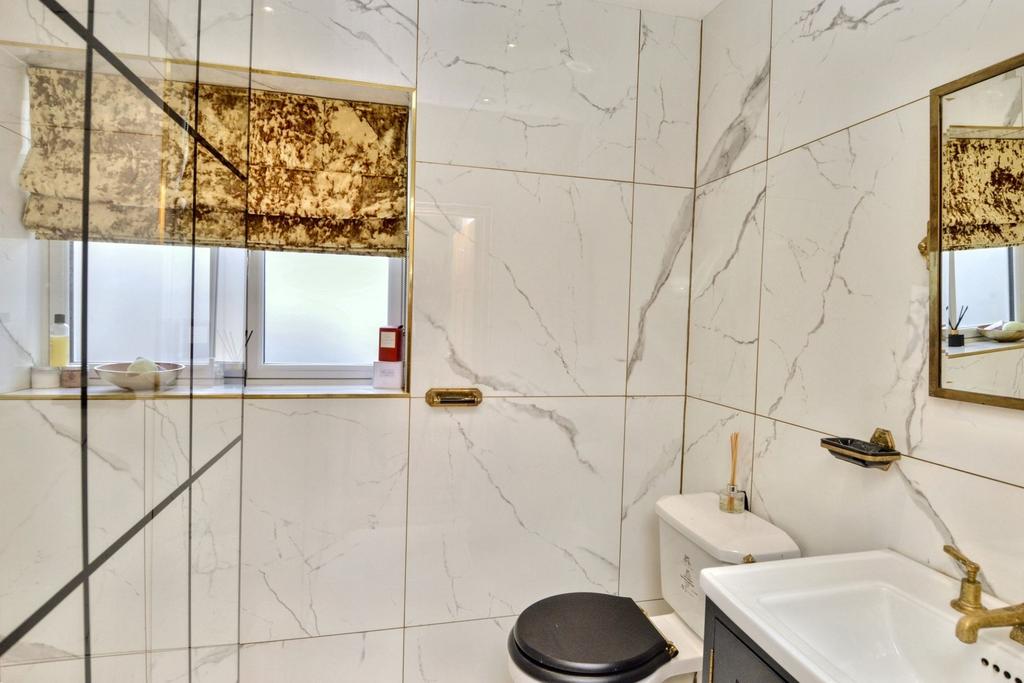 Stepping inside, a spacious hallway provides access to the bedrooms, shower room, and main living areas. Bedroom two, located at the front, features a window overlooking the front aspect and fitted inset wardrobes. Bedroom four, positioned at the rear, offers a lovely garden view, while the stylish shower room boasts an open double walk-in shower.