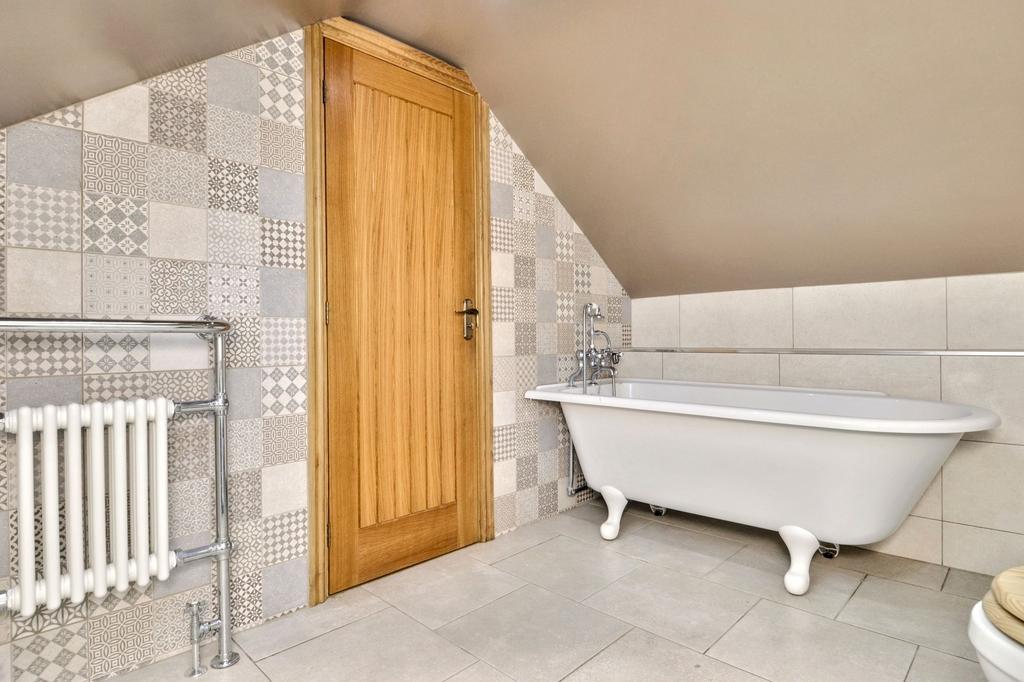 Upstairs, the first floor hosts the main bathroom and two additional bedrooms. The bathroom is spacious and elegant, complete with a skylight, bath, sink, and WC. The main bedroom enjoys inset wardrobes, fitted cupboards, and a front-facing window, while bedroom three features a skylight and built-in wardrobes, creating a bright and airy retreat.
