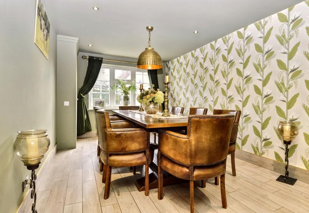 Adjacent to the kitchen is a well-equipped utility room with modern cabinetry, integrated appliances, and garden access. The vast kitchen and dining space is a true focal point, boasting contemporary units, a breakfast island, and ample storage, all complemented by views of the rear garden through double patio doors. A feature staircase in the dining area leads to the first floor, enhancing the home's grandeur.