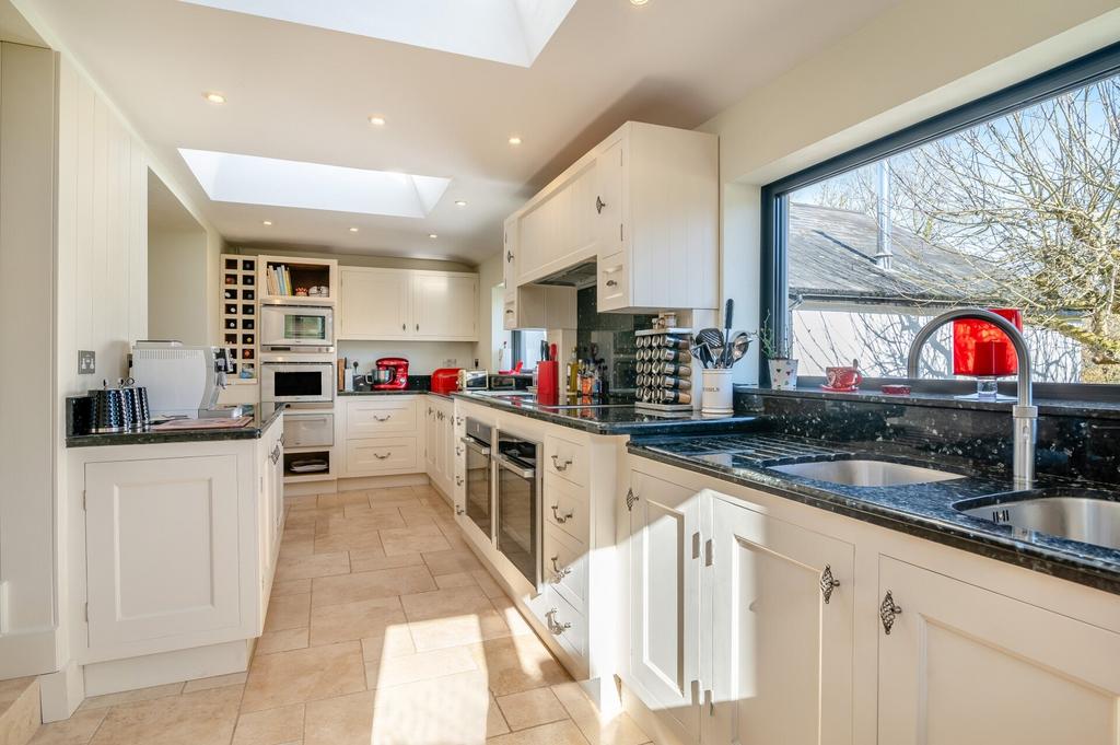 Serving this part of the house is a stylish cloakroom with marble-effect tiling on the floors and walls. An extension, skilfully blended with the older parts of the property, is tailor-made for modern lifestyles.