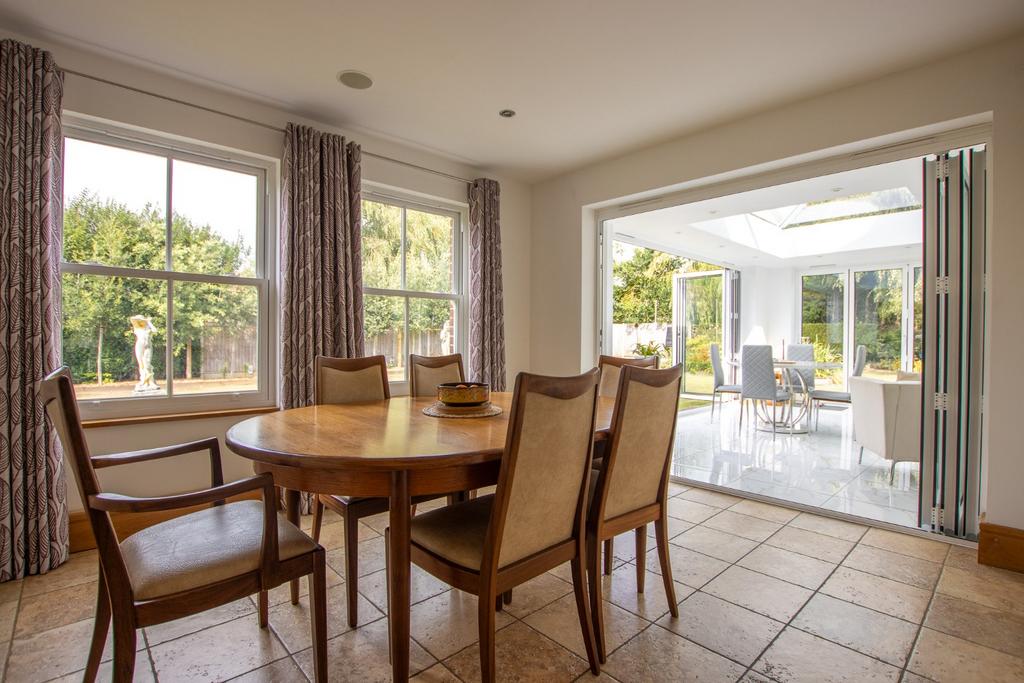 Visitors are welcomed into the superb reception hall, which extends through the centre of the ground floor, with stairs to the first floor landing and a door into the ground floor cloakroom. To one side of the hall is the impressive 26ft sitting room, with a pair of windows to the front and a wood burning stove in an inglenook fireplace which serves as the main focal point. Across the hall is the equally well-proportioned kitchen/breakfast room, which comprises an extensive collection of oak fronted storage units under granite work surfaces and a matching central island. To the front of the kitchen there is a pleasant seating area, with views across to the mill pond. The adjacent utility room offers further storage units and space for additional appliances. The kitchen leads into the dining area, which enjoys views over the rear garden and has a set of bi-folding doors which open into the stunning orangery. With a roof lantern and bi-folding doors opening to all four sides, the orangery is filled with natural light and allows the ground floor accommodation to flow from one room into another.