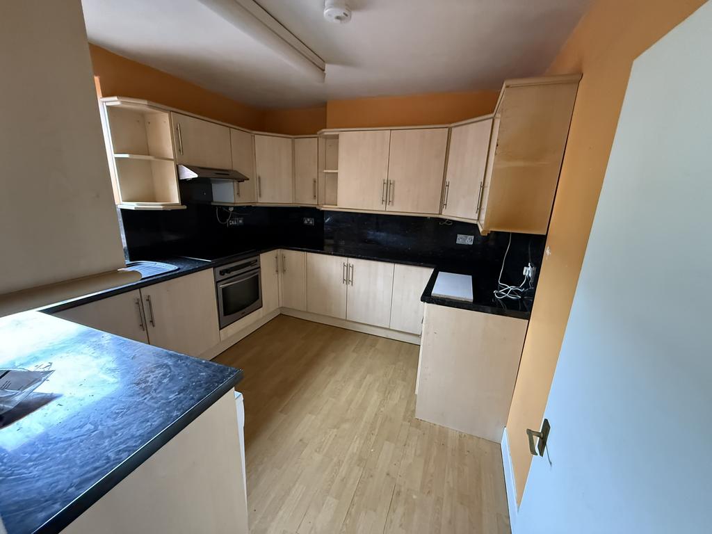 Double glazed sash window to rear, base and wall units, 1½ Bowl and single drainer sink unit with mixer taps over, 4-ring electric hob, electric oven and filter hood over, appliance spaces and plumbing for Dishwasher, wood effect flooring.