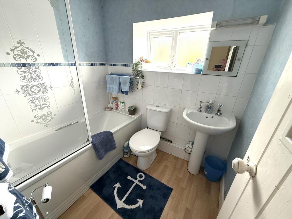 Panelled bath with ‘Redring’ shower and glazed shower screen over, double glazed window to rear, pedestal wash hand basin, tiled splashbacks and low level flush WC