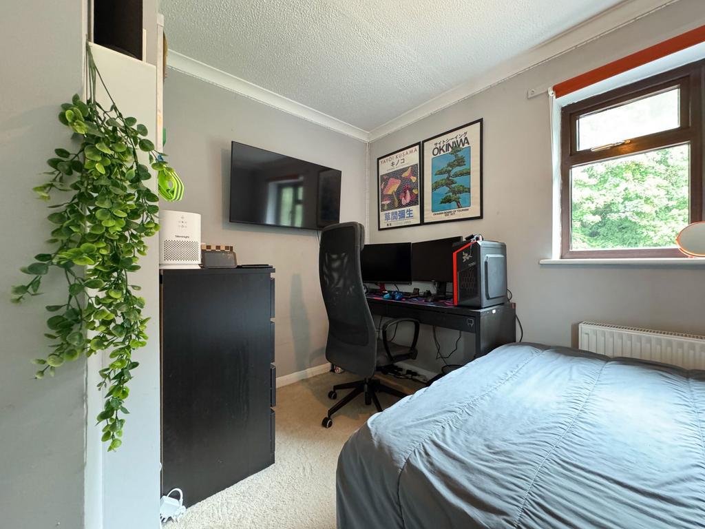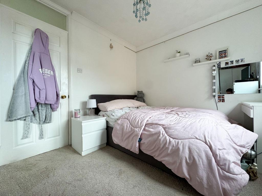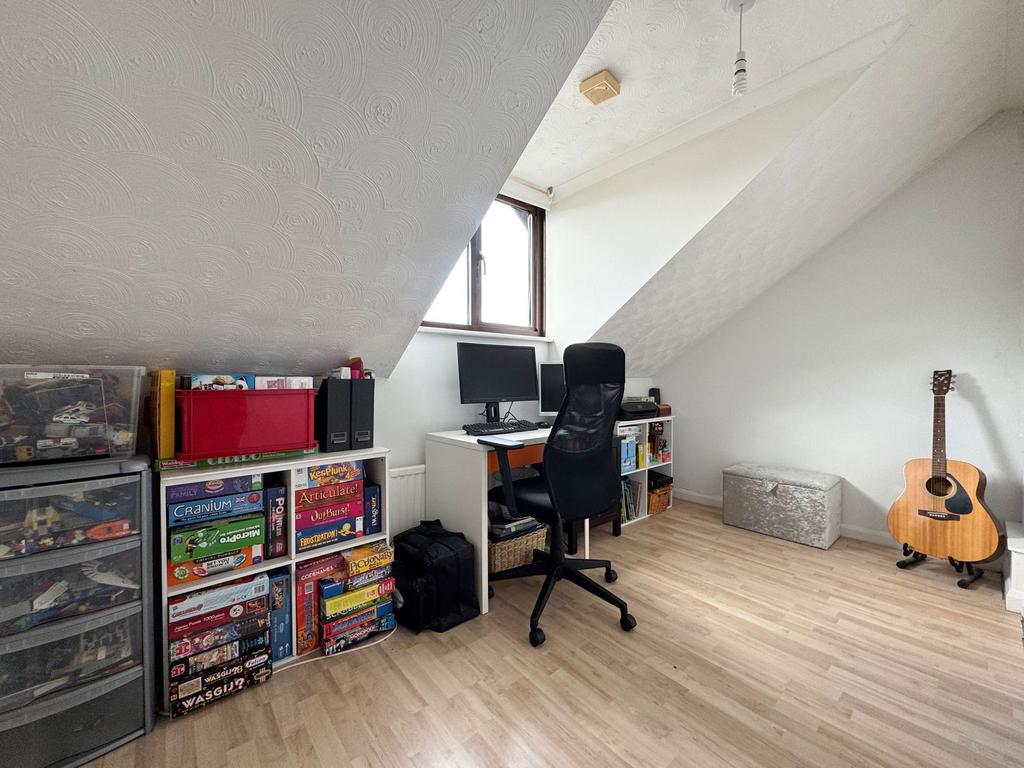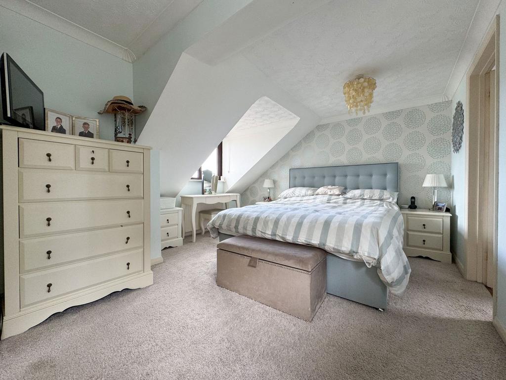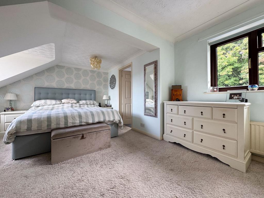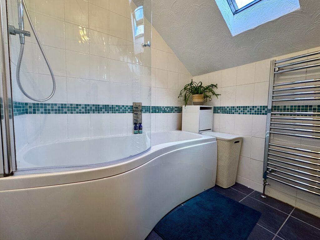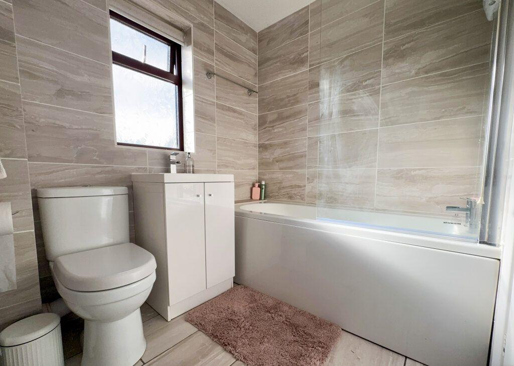 The second bedroom is equally spacious, offering a well-proportioned area with the added convenience of a built-in storage cupboard. Bedrooms three and four are both wonderfully light-filled, providing ample space for comfortable living. The main family bathroom is a modern haven, featuring a bath with a shower, toilet, and wash basin. The neutral tiling perfectly complements the white fixtures, enhancing the contemporary and sophisticated feel of this beautifully appointed space.