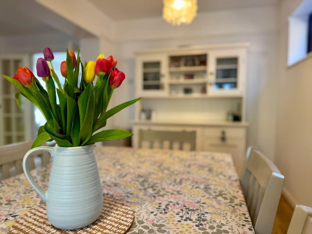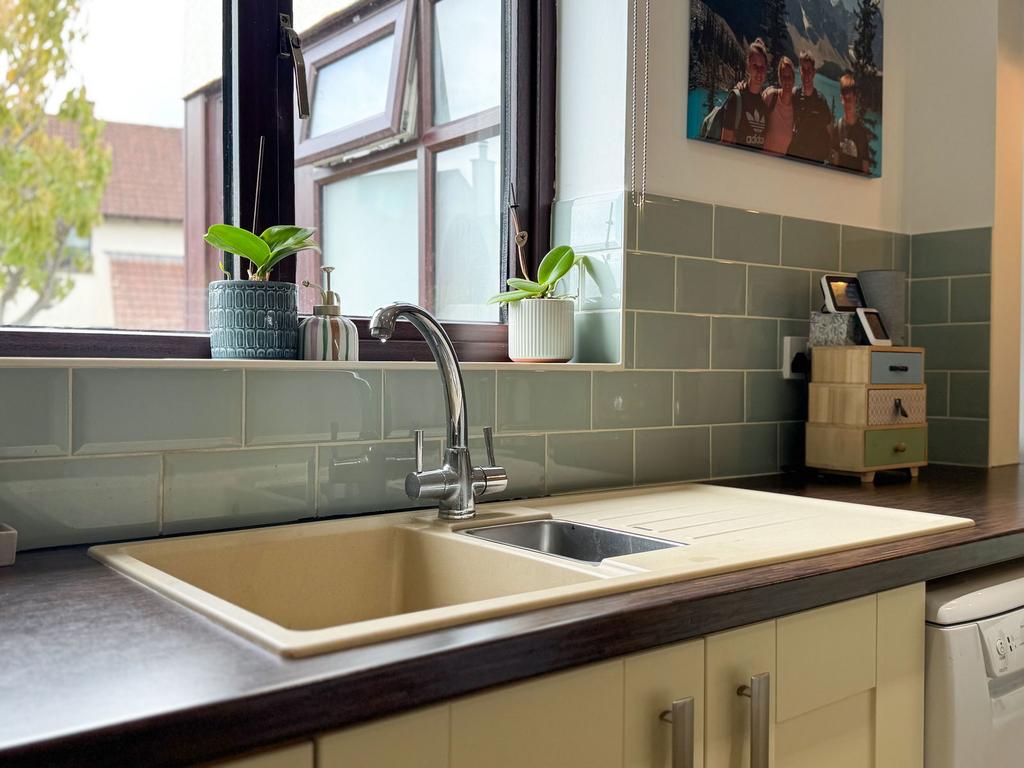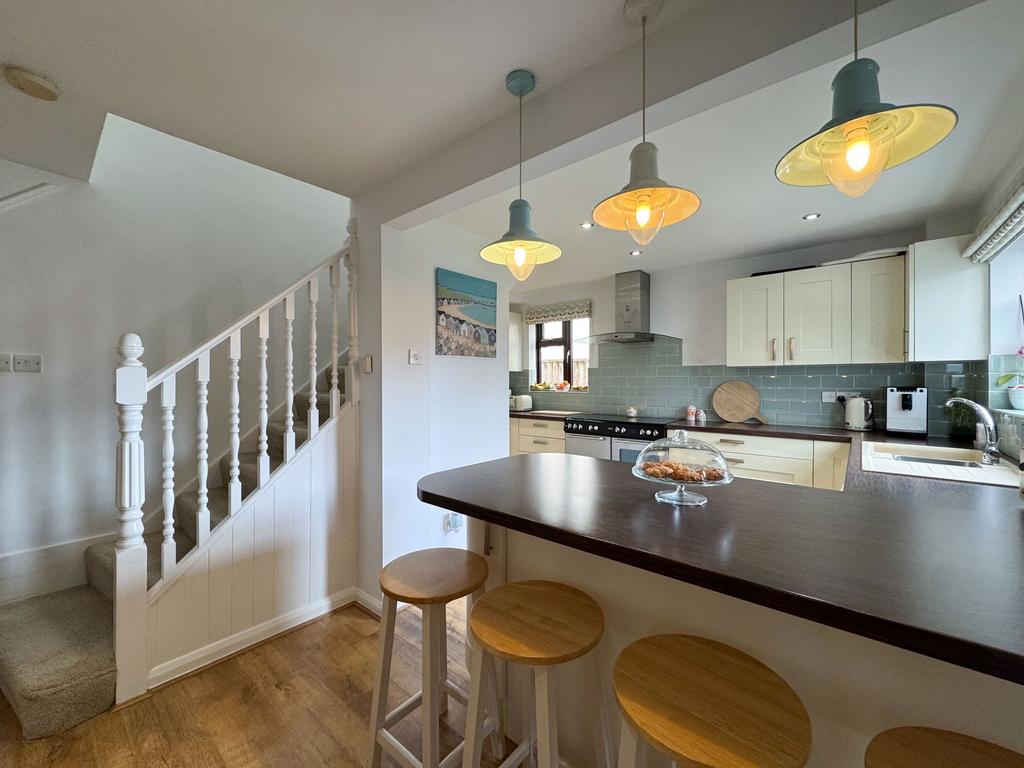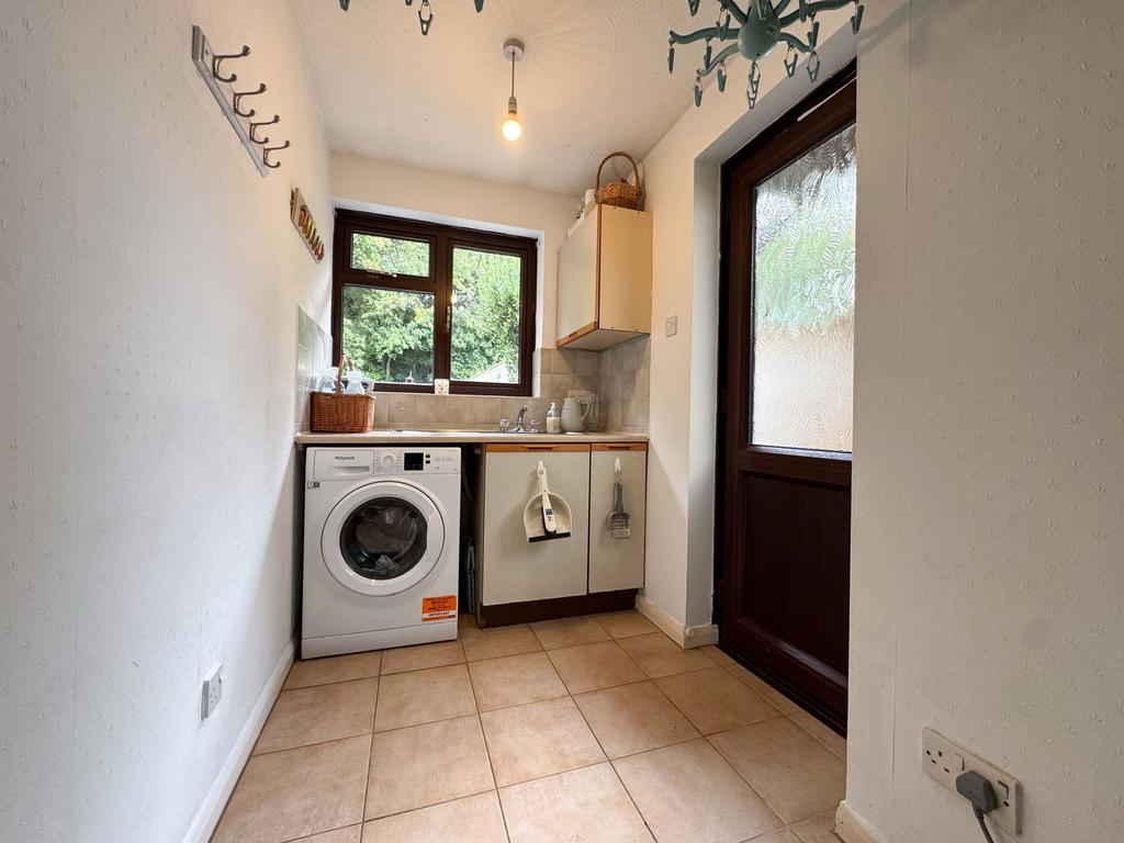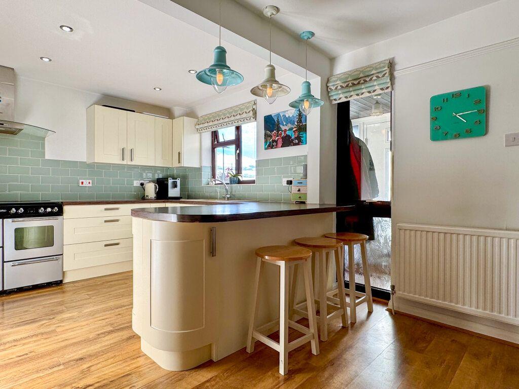 Continuing through, you are drawn into the expansive and contemporary kitchen, designed with family living in mind. The kitchen, complete with a breakfast bar, combines elegant cream wooden cabinetry with dark oak roll-top work surfaces, enhancing the light and airy ambiance of the space. Adjacent to the kitchen, you'll find a discreet under-stairs storage area, perfect for use as a pantry, as well as a well-sized utility room, equipped with plumbing for a washing machine and additional space for other household essentials.