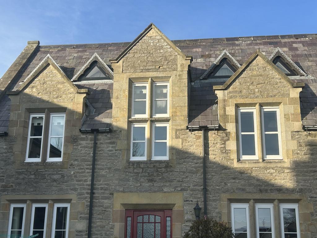 No. 9 Manor Court comprises a spacious three bedroom apartment with accommodation arranged over the first and second floors situated within the main building of a former school. The property is constructed of traditional stone under a slate roof and benefits from timber double glazed windows and night storage heating. The entrance to the flat is located on the ground floor (blue door) and this is a shared with No. 7 Manor Court, leading to a staircase and a private entrance on the first floor.