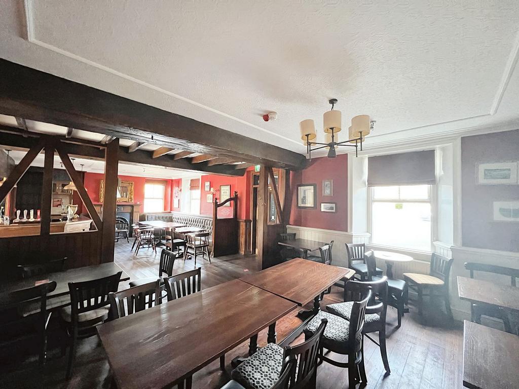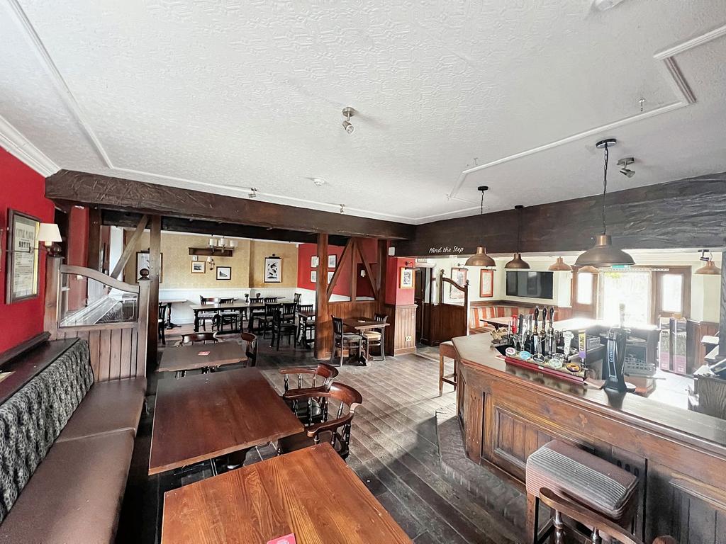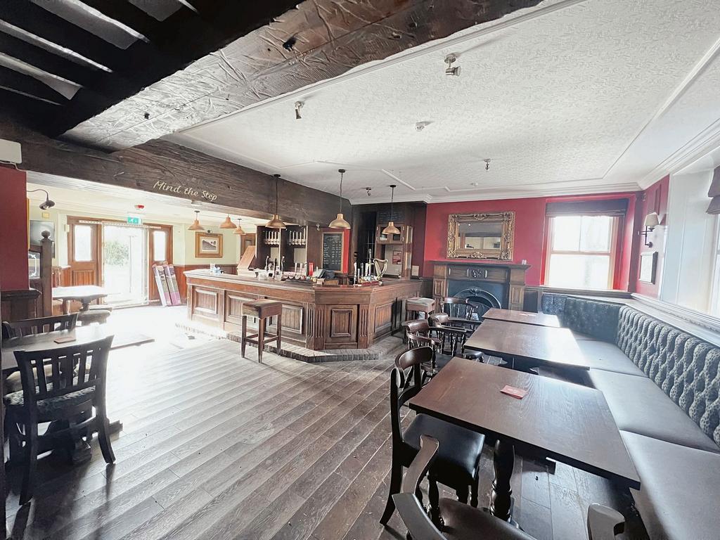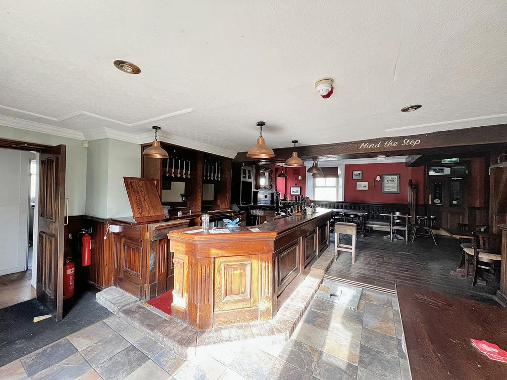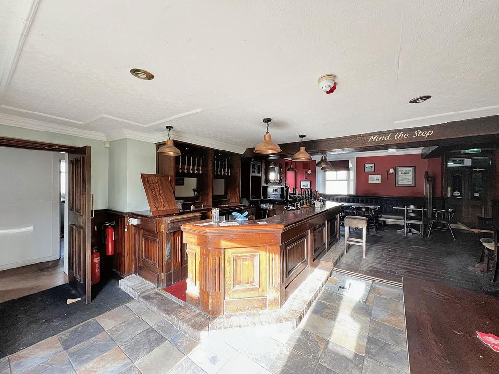 The property is a detached building constructed from stone, featuring a pitched slate roof. Enter through the front porch, which leads to a traditional, open-plan bar area full of character. The bar boasts a partially polished wooden floor, exposed ceiling beams, an open fire with an attractive surround, and a striking central bar servery. The bar area offers seating for approximately 50-60 people, with fixed perimeter seating and a mix of chairs around polished timber tables.