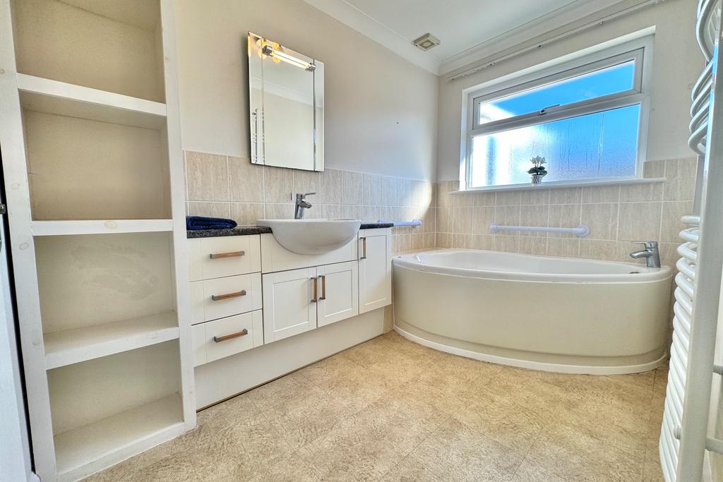 There are three good sized bedrooms, all situated at the front of the bungalow. The principal bedroom has an en-suite shower room comprising walk-in shower, oval wash basin with attractive vanity wash basin and WC. Bedroom 2 has fitted wardrobes and has some views of the Purbeck Hills. The family bathroom is fitted with a white suite including corner bath, wash basin with cupboards under and shelving. The cloakroom completes the accommodation.