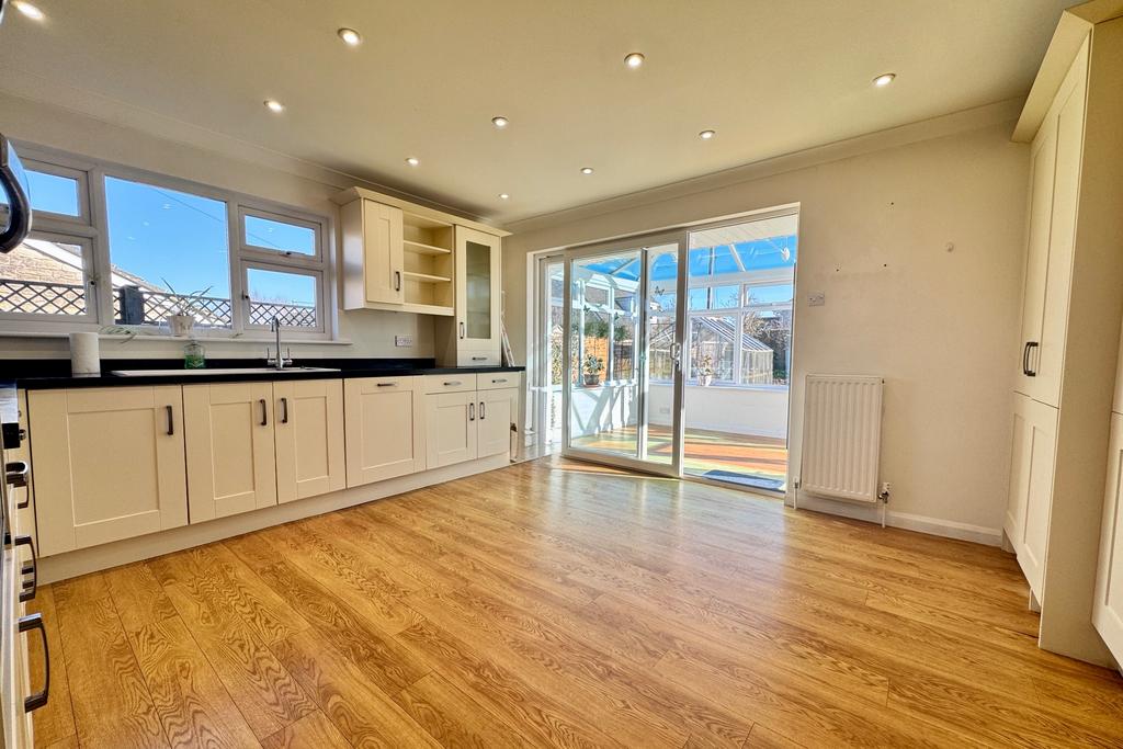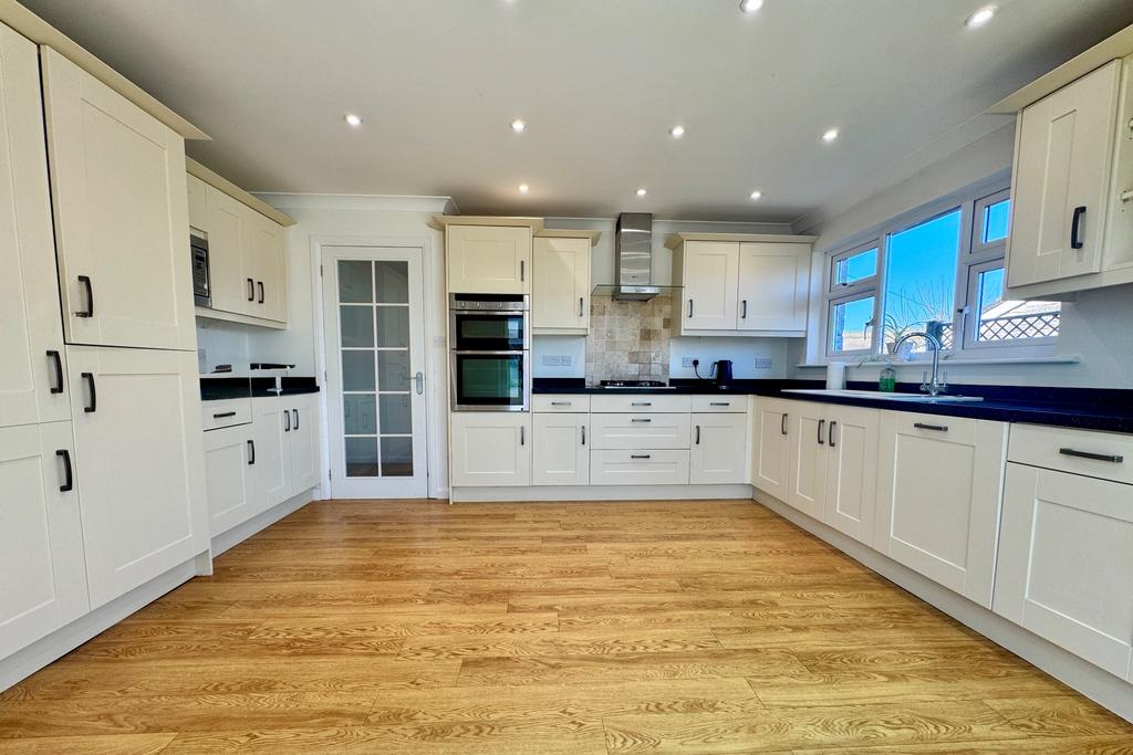 The spacious entrance hall welcomes you to this modern bungalow and is central to the accommodation. Leading off, the living room is particularly light enjoying dual aspects and has a Purbeck stone fireplace with fitted gas fire. Double doors lead to the South facing garden, harmoniously blending the indoor and outdoor living space. The kitchen is fitted with a stylish range of cream units including floor to ceiling storage cupboards. Integrated appliances include gas hob, double electric oven, microwave, fridge freezer, washer/dryer and dishwasher. Sliding doors lead to the conservatory which enjoys views over the garden. There is also access to the garden from this room.