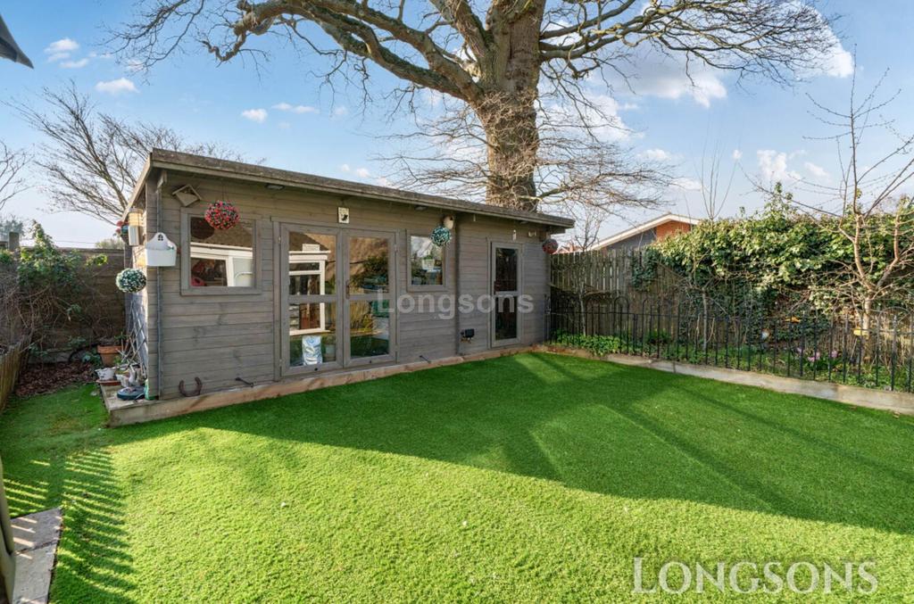 Enclosed low maintenance rear garden laid to artificial grass, large wooden summer house/workshop with electric power and lights, paved patio seating area, fish pond, outside lights, outside tap, fruit trees, shrubs and plants to beds and borders, wooden fence to perimeter, gated access to front.