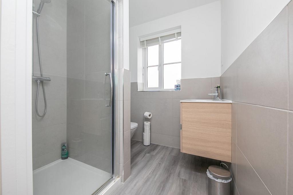 Double glazed obscured window to rear, part tiled walls, wall hung vanity unit, shower enclosure, low level WC.