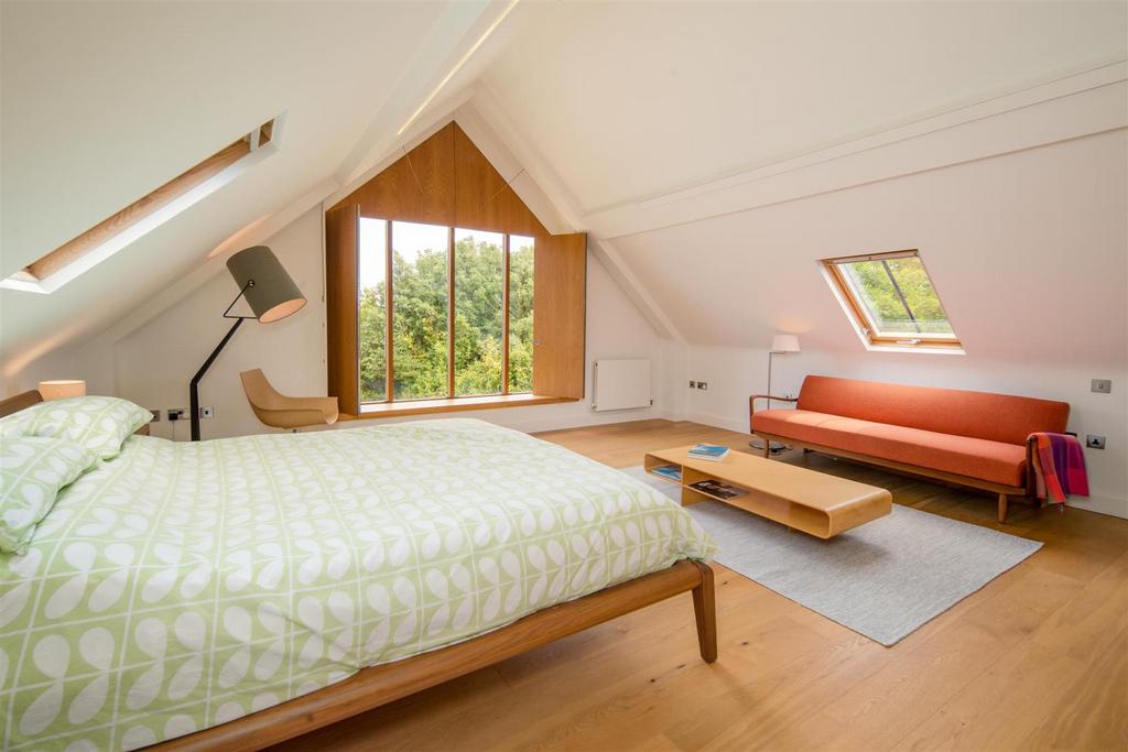 This impressive principal suite is accessed through a luxurious bathroom with freestanding bath and walk-in shower. Wall mounted wash basin, vanity unit, hidden cistern W.C. and heated towel rail, as well as electric underfloor heating The main bedroom is substantial with impressive high ceilings and a picture window overlooking the eastern aspect with bespoke oak shutter blinds. Built in wardrobe storage and Velux windows provides additional views to both the walled garden and Bembridge Harbour.