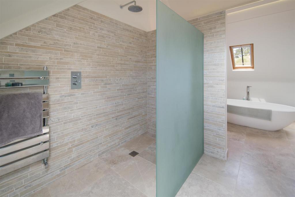 An ideal guest suite tucked away at the end of the house with automatically operated Velux windows and fitted blinds. There is a full bank of oak fronted wardrobe storage and a walk in ensuite wet room, with sliding glass door, wash basin, heated towel rail and hidden cistern W.C.