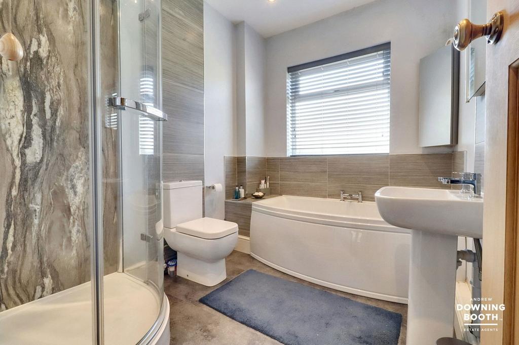 A stunning bathroom is fitted with a contemporary white suite, including a low-level flush WC, pedestal wash hand basin, panelled bathtub with chrome mixer tap, and a shower enclosure with rainfall style shower and separate showerhead attachment. There is also an anthracite wall mounted heated towel rail, recessed ceiling spotlights, tile effect flooring, partially tiled walls and a rear facing UPVC double glazed window.