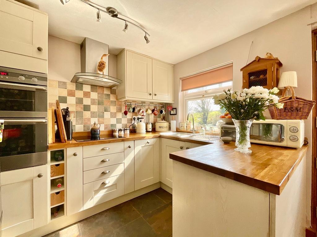 The full width kitchen/diner is fitted with a modern range of wall and base, units having hardwood work surfaces with walk in pantry housing an oil fired boiler. A slate floor extends to the dining area with feature brick wall and central fire place with wood burner.