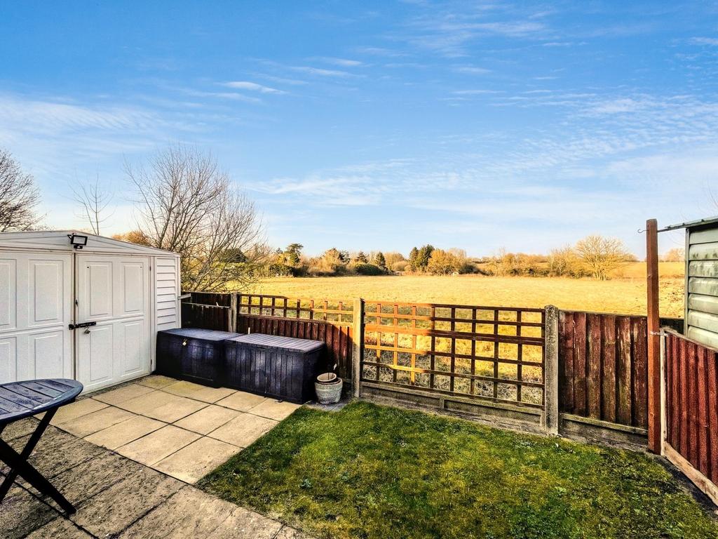Patio area for seating. Laid to lawn area. Low fencing to provide field views. Large shed which will be left behind.