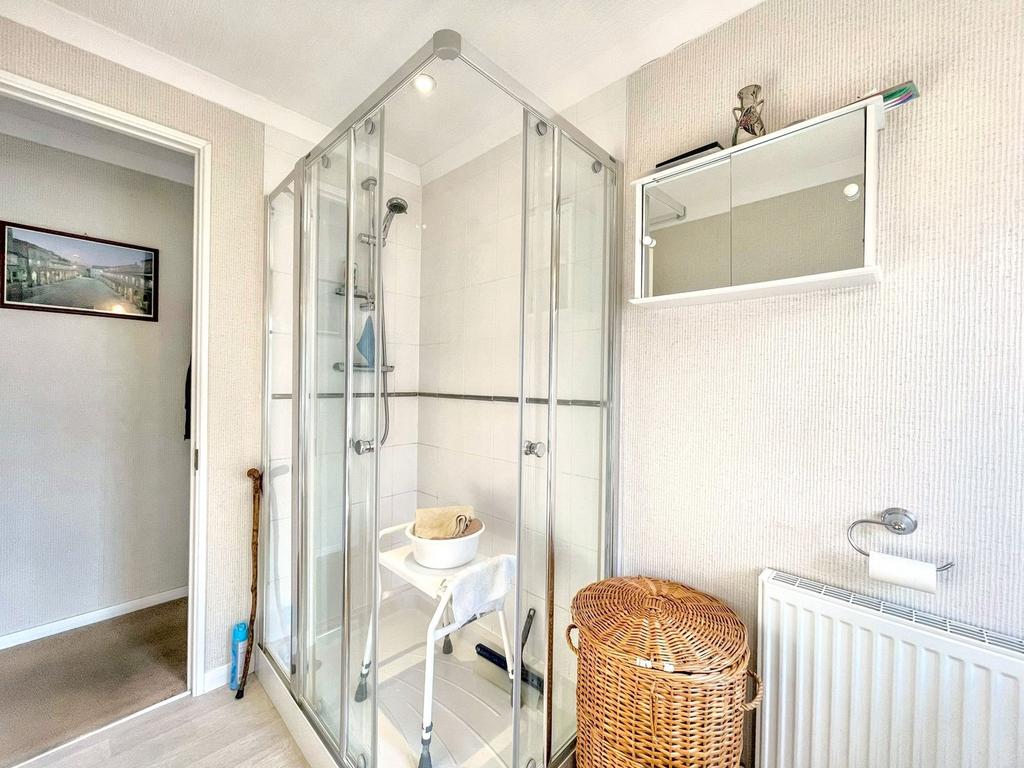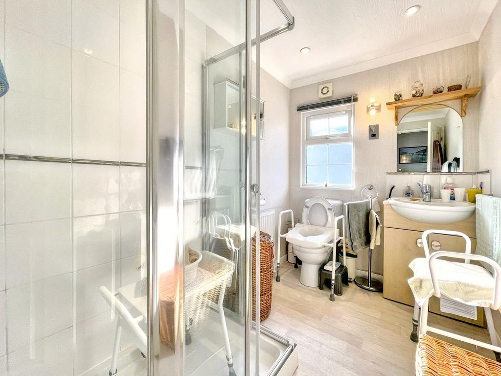 1.69m x 2.60m (5' 7" x 8' 7") Well presented shower room with three piece suite to include double walk-in shower, WC and vanity wash basin. Inset spotlights and a featured wall light. Extractor fan. Radiator. Double glazed frosted window. Fitted laminate flooring.