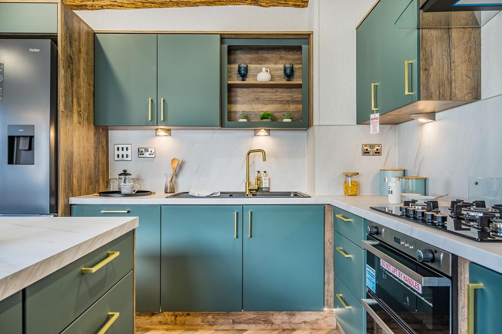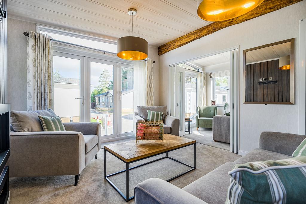 The lounge embodies cosiness and sophistication with its luxurious suite, recessed electric fire, and beautifully crafted furniture. French doors and bifold doors invite natural light to pour in, seamlessly connecting indoor and outdoor spaces. The exterior is equally inviting, featuring a private patio, grain-effect cladding, and practical touches such as an external socket and durable roofing.