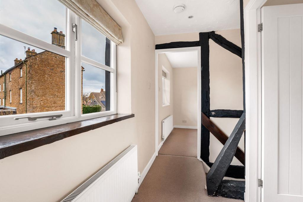 Entrance Hall with exposed painted beams, stairs to first floor.