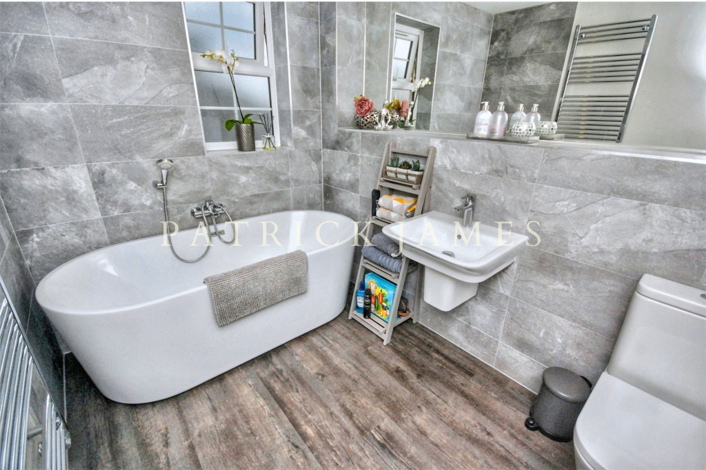 Stylish and modern, featuring a freestanding bath, low-level WC, wall-mounted basin, towel rail, wall-mounted mirror, and part-tiled walls.