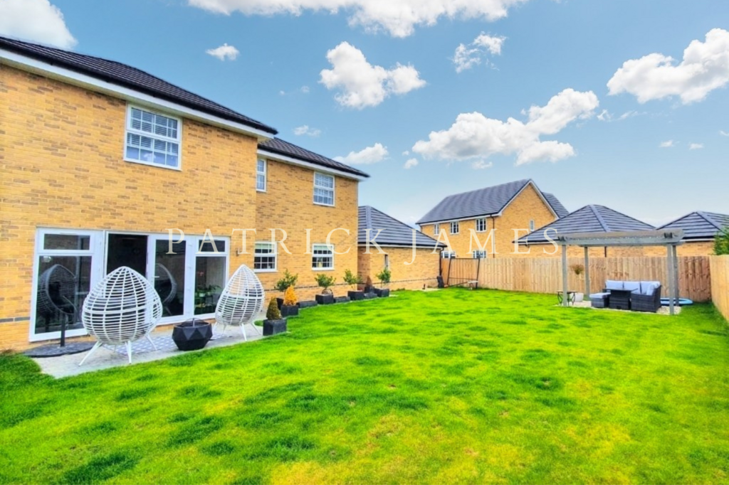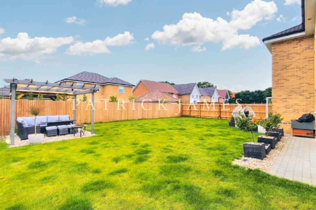 A generously sized garden, mainly laid to lawn, with a patio area and pergola to the rear. Enclosed by fencing, with side access leading to the driveway.