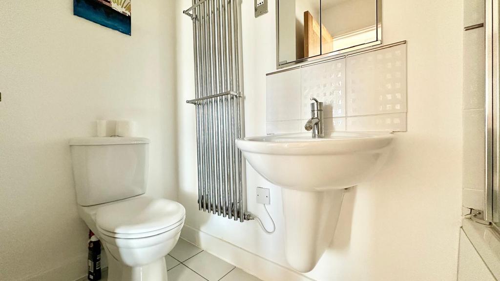 The apartment features two well-proportioned double bedrooms, with the master bedroom benefiting from its own ensuite bathroom. There is also a modern family bathroom and an additional WC located on the ground floor, providing added convenience for residents and guests.