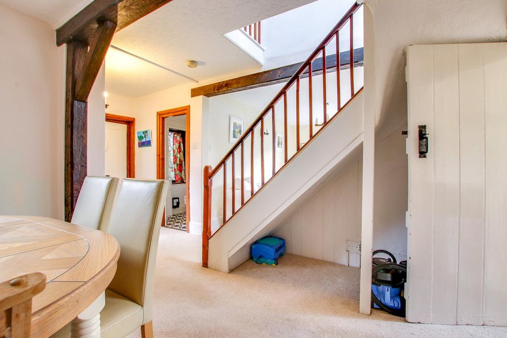 To the right of the staircase, the dining room has a wealth of period features and front aspect view of the garden. Doors lead to the bright and airy kitchen/breakfast room with rear and side aspect windows and a stable door leading to the garden. The kitchen is fully tiled and fitted with a range of base and eye levels units comprising an electric hob, cooker and stainless steel sink.