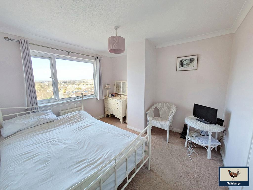 Main Bedroom: A double bedroom with built in storage wardrobes for storage and offering far reaching views towards Kit Hill.