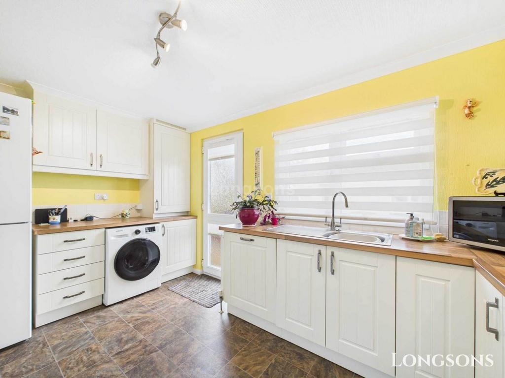 Modern fitted kitchen units to wall and floor, worksurface over, stainless steel sink unit with mixer tap and drainer, integrated dishwasher, integrated electric oven, integrated gas hob with extractor hood over, space for tall fridge/freezer, space and plumbing for washing machine, tiled splashback, UPVC double glazed window to side aspect, UPVC double glazed entrance door to side, radiator.