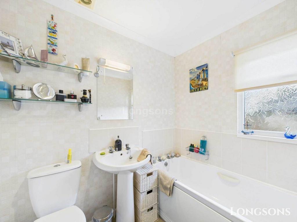 Bath, wash basin, WC, tiled splashback, extractor fan, obscure glass UPVC double glazed window to side aspect.