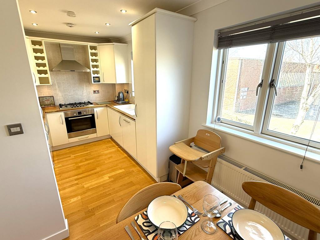 An open wood staircase leads from the hallway up to the first floor landing off which is an open plan sitting/ dining room with front facing “Juliet” balcony, and access round to a fully fitted kitchen with integrated appliances, including dishwasher, washing machine and fridge / freezer. The staircase continues up to the second floor landing leading to the master bedroom with built in wardrobes and a further double bedroom and family bathroom.