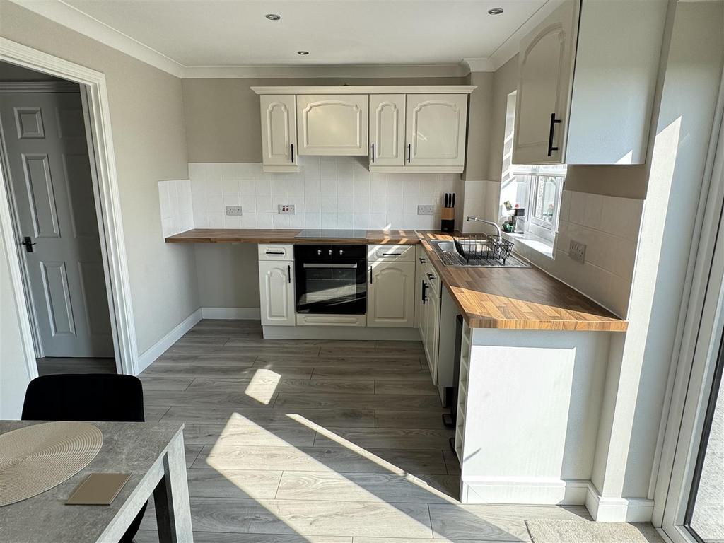 Kitchen/Diner: - 14'8" x 8'9" - A well lit kitchen/diner with Upvc double glazed patio doors providing access to the enclosed and secure rear garden. Further Upvc double glazed window to rear elevation, both combine to provide tremendous natural light. Updated matching wall and base kitchen units. Roll top wood effect work surfaces. Stainless steel sink with matching draining board with central mixer tap. Fitted four ring buttonless hob with fitted extractor hood above and electric oven below. Space for additional kitchen appliances. Space for upright fridge/freezer. Space for dining table. Continuation of updated wood effect laminate flooring. Tiled walls to water sensitive areas. Radiator.