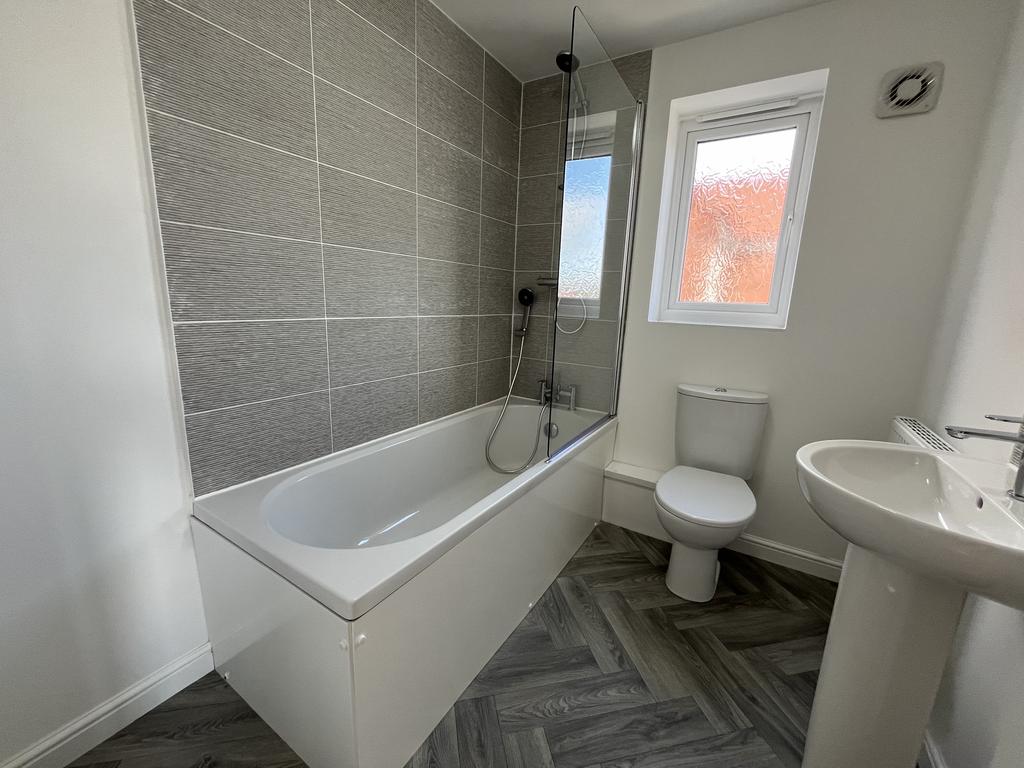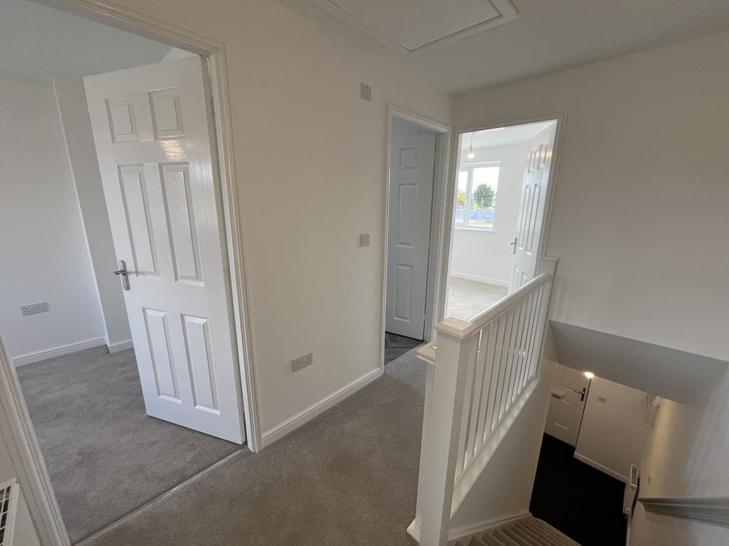 Stairs and landing leading to 3 bedrooms. Bathroom with shower over bath.