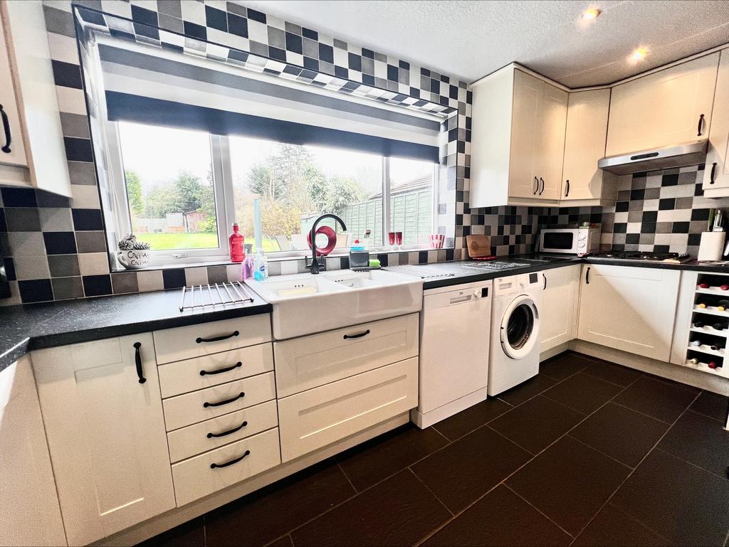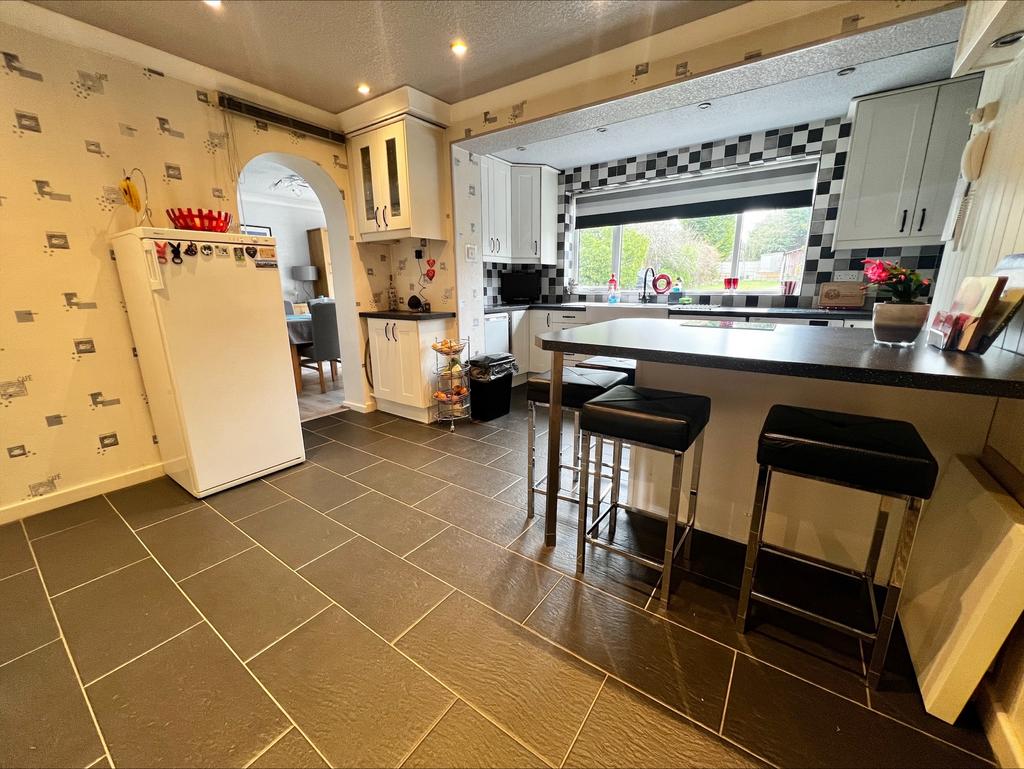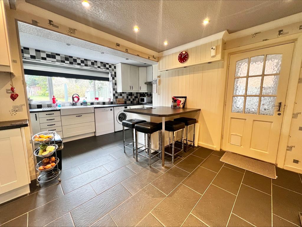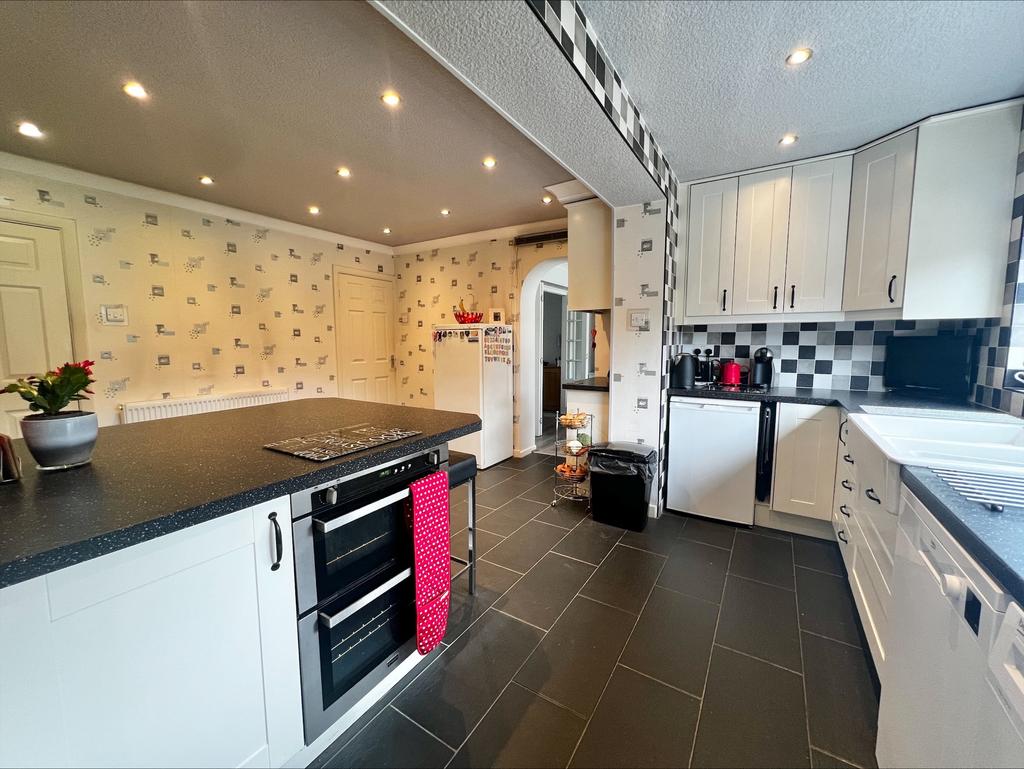 Having a tiled floor, central heating radiator, a selection of wall and base units with splashback wall tiles, laminated worksurface with gas hob inset with extractor hood over, double bowl belfast sink with mixer tap over, laminated breakfast bar with base unit storage providing a built-in double electric oven, UPVC double glazed window to the rear, with door access to the an under stairs storage cupboard, a selection of ceiling spotlights, door leading thereof