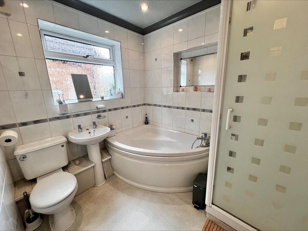 Having vinyl flooring, tiled walls, central heating radiator, close coupled WC, wash hand basin with hot and cold taps over with pedestal below, offset corner bath with hot and cold taps over, glass framed shower enclosure with electric shower and attachments, wall mounted extractor fan, ceiling spot lights