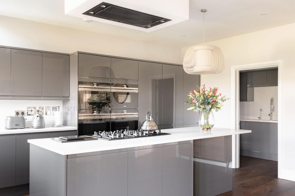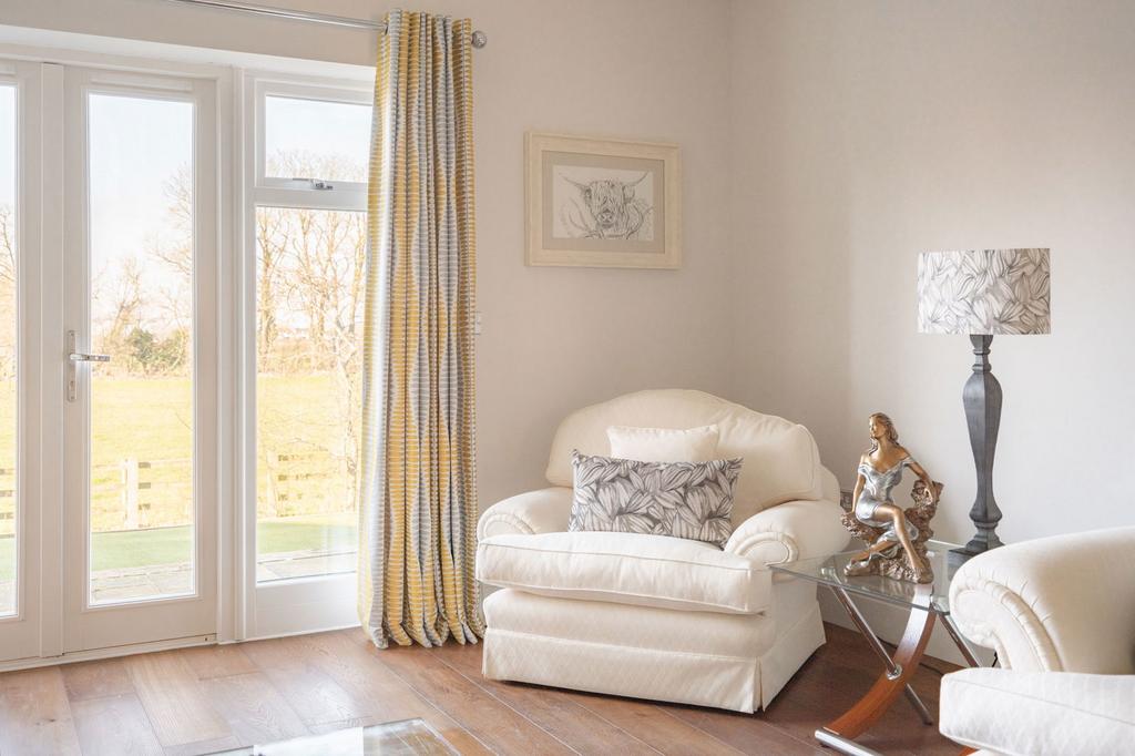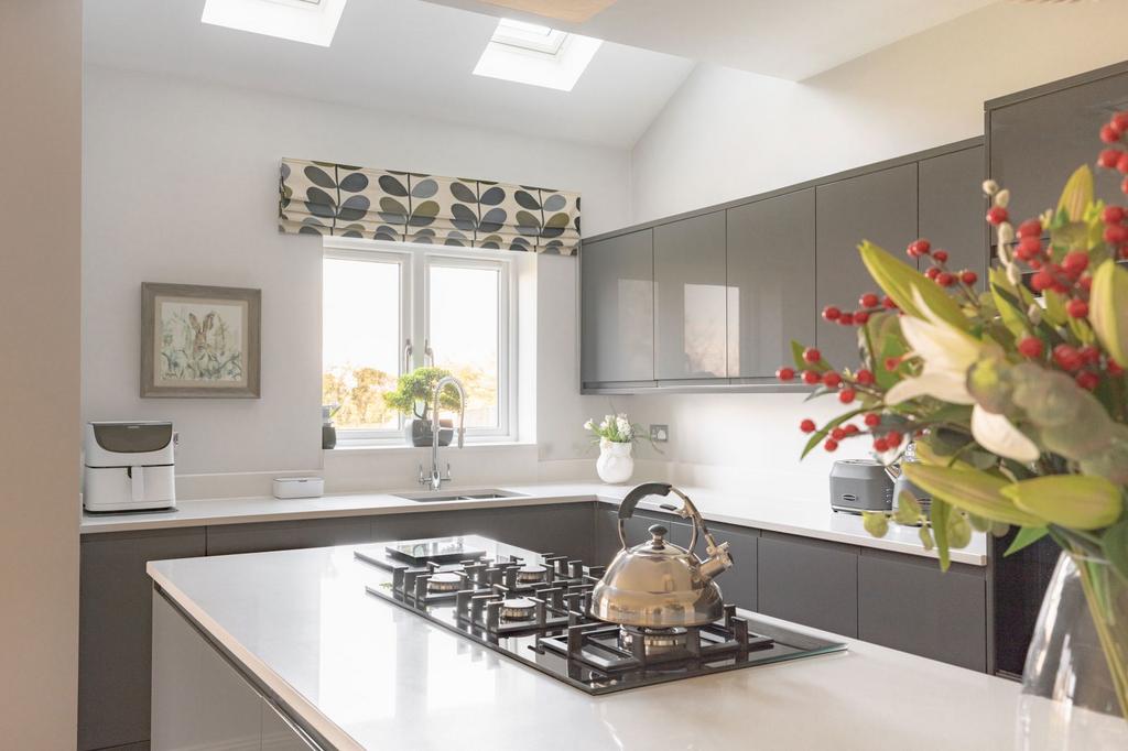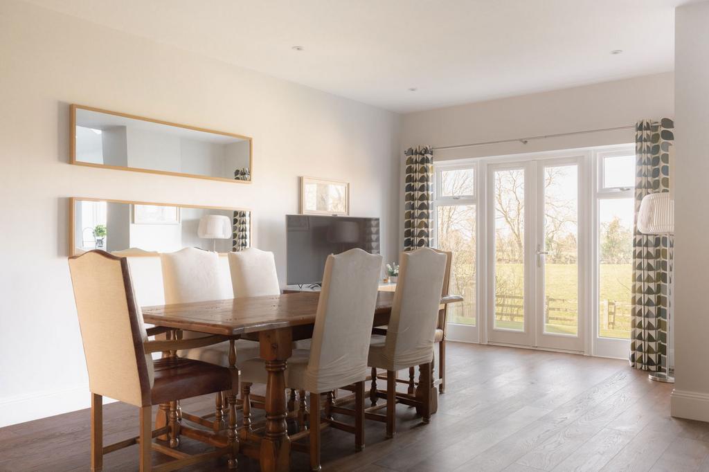 Inside, a spacious reception hall with built-in storage and a cloakroom leads seamlessly into the open-plan kitchen and dining area. The kitchen is a striking example of modern design, with sleek quartz countertops, an array of high-end Siemens appliances, including twin electric ovens, a steamer oven, combination oven, a five-ring gas hob, and a full-height fridge and freezer. A central island with a breakfast bar serves as the heart of the space, and the generous proportions allow for both a large dining table and a comfortable seating area. French doors open directly out to the garden, framing uninterrupted views of the countryside. A utility room off the kitchen offers practical space for laundry appliances, and includes a water softener.